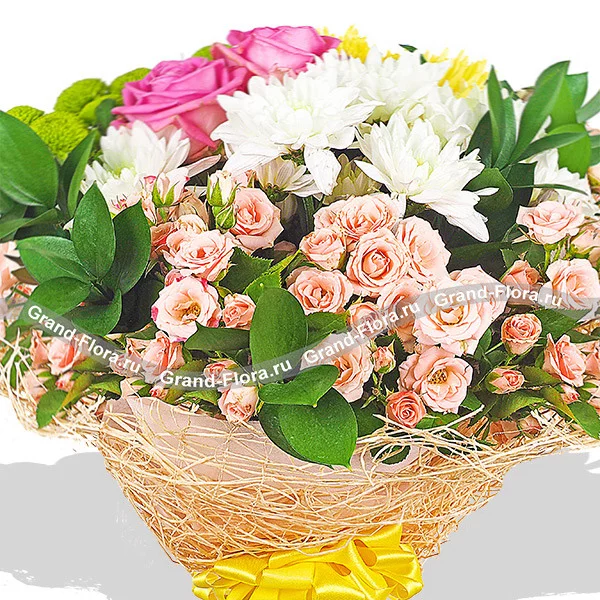 Стандартный (на фото): роза розовая (аква) - 3 шт, роза кустовая розовая - 4 шт, хризантема кустовая белая - 2 шт, хризантема кустовая зеленая(возможна замена на ромашковидную окрашенную) - 1 шт, хризантема одноголовая желтая - 2 шт, рускус, натуральная упаковка, желтый бант.Примерный диаметр букета 30х30 см.