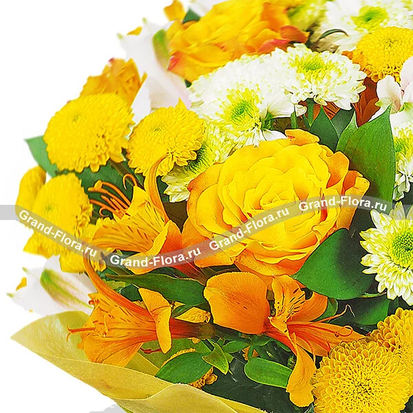 Стандартный (на фото): роза желтая/оранжевая - 5 шт, хризантема кустовая желтая - 3 шт, альстромерия желтая - 2 шт, альстромерия белая - 1 шт, хризантема кустовая белая - 3 шт, рускус, фетр зеленый.