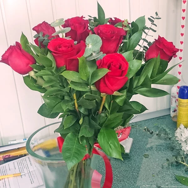 Букет из красных роз, гармонично дополненный рускусом и эвкалиптом, станет отличным поздравлением как для женщин, так и для мужчин.