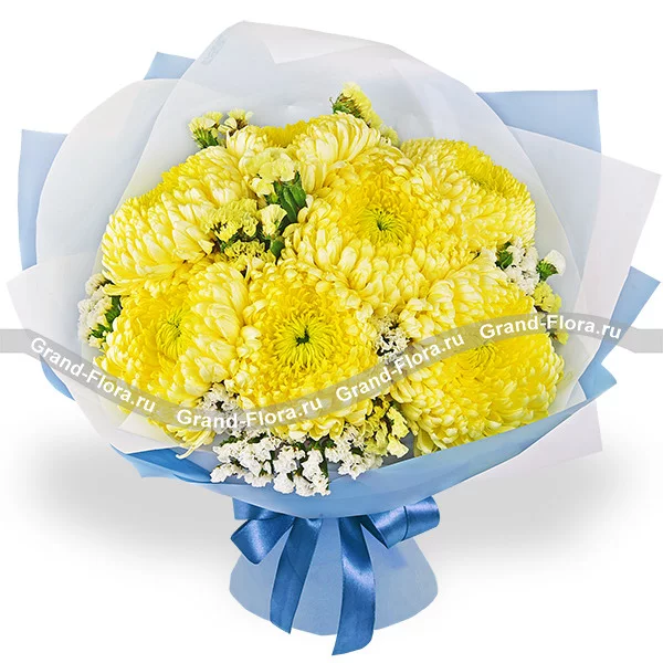 Стандартный: хризантема шамрок желтая - 7 шт., статица, упаковка, лента.