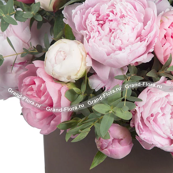 Стандартный: пион розовый - 8 шт., пион белый - 7 шт., декоративная зелень, оазис, коробка.