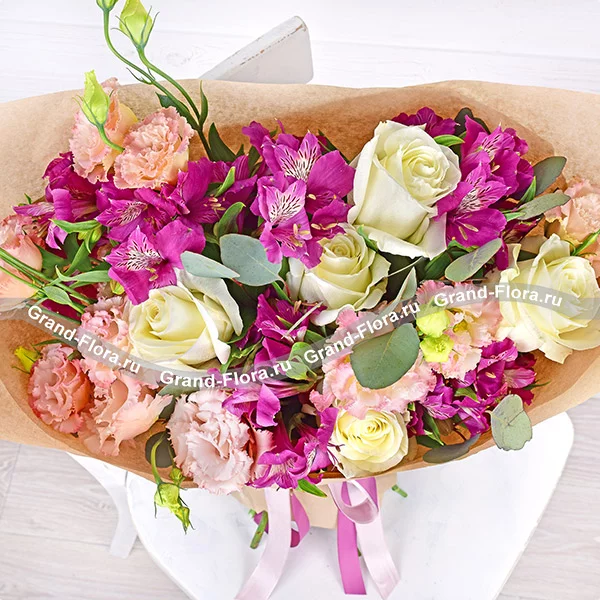 Роза белая- 5 шт., эустома розовая – 5 шт., альстромерия фиолетовая/розовая – 5 шт., декоративная зелень (эвкалипт) – 3 шт., упаковка, лента.