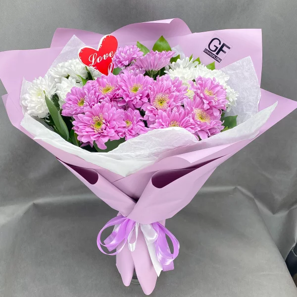 5 хризантем: хризантема кустовая белая - 3 шт., хризантема кустовая розовая  - 2 шт.,  декор сердечко , упаковка, лента