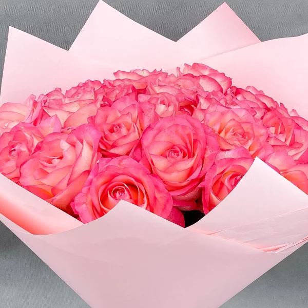 роза розовая - 25 шт., упаковка, лента. Оттенок роз может отличаться от представленного на фото